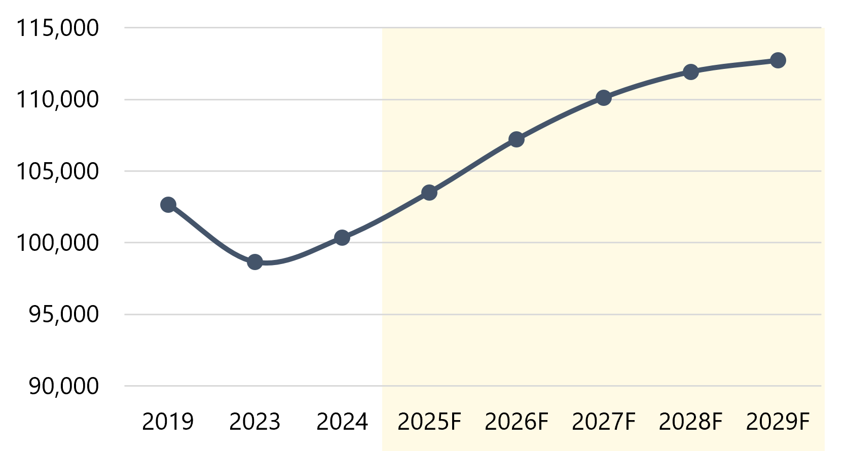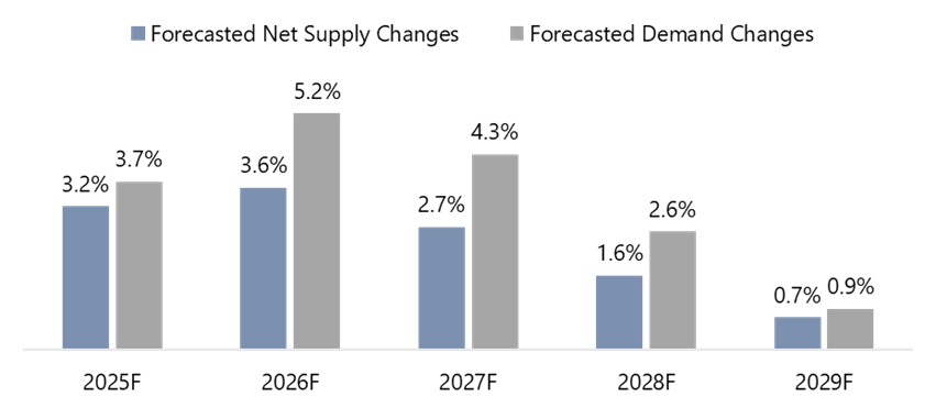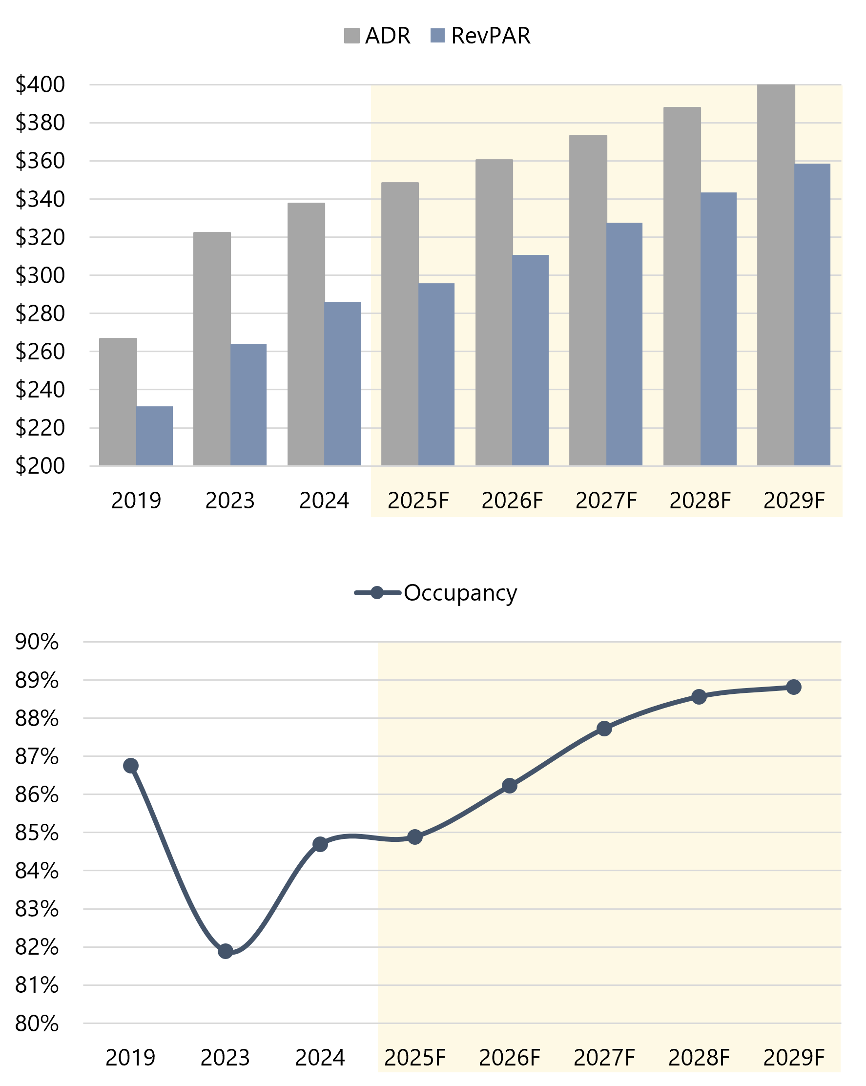 Strengthening demand and a constrained supply pipeline are expected to support continued ADR growth. Contributors to the anticipated demand growth include the sustained return of international leisure travelers, further gradual return of business travel, and stronger meeting and group activity. Occupancy is anticipated to reach the mid-to-high 80s by 2026/27, mirroring the market’s performance in the decade prior to the pandemic. We have forecast occupancy to stabilize at 88.8% in 2029, modestly higher than the 2019 peak, given the restricted supply pipeline.