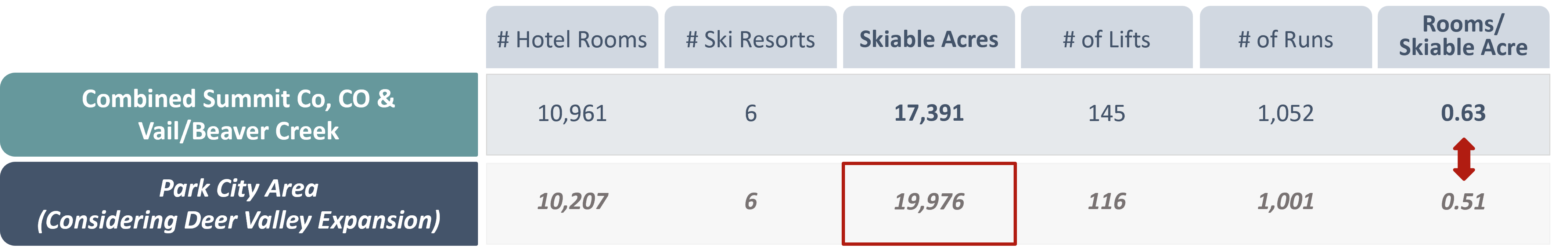 Given the size of Park City market, the combined metrics shown below were determined to be the most appropriate basis for comparison. Upon completion of the Deer Valley expansion, the greater Park City area will comprise nearly 20,000 skiable acres, exceeding the combined skiable terrain of Summit and Eagle counties in Colorado, which together encompass approximately 17,400 skiable acres.