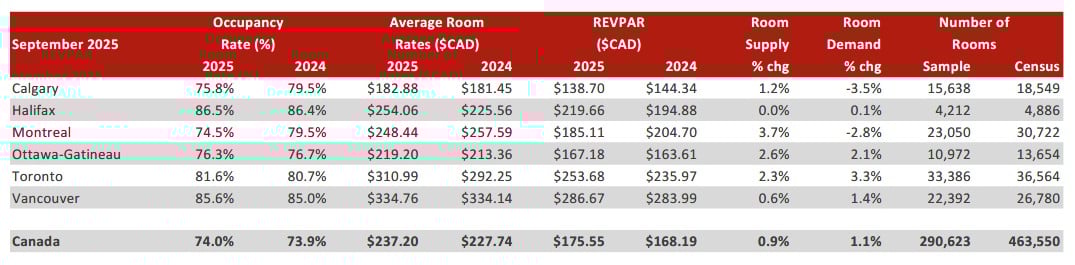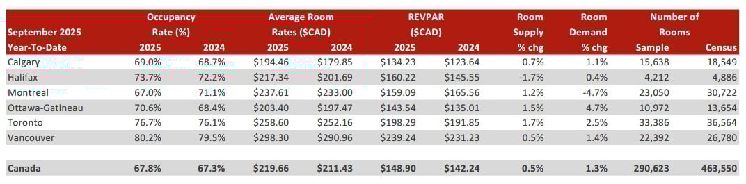 Through the third quarter, Canada, had strong RevPAR growth of 4.7%; however large disparities among markets are being witnessed across the country. Northern Alberta is leading with over 23% RevPAR growth year-to-date while Prince Edward Island and Saskatchewan are tied in 2nd and 3rd positions at 12.5% RevPAR growth. Markets facing high US tariffs or absorbing significant new supply in their markets are not faring nearly as well.