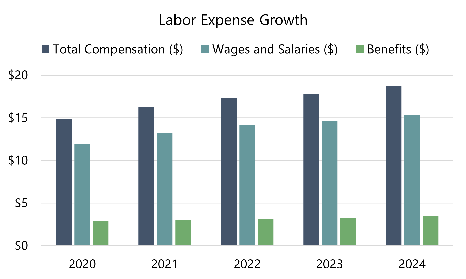 According to Bureau of Labor Statistics data, salaries, wages, and payroll-related expenses for the Accommodation and Food Service industry have increased significantly between calendar-year 2020 and calendar-year 2024. Total compensation increased 26.5% between 2020 and 2024, outpacing the increase in the Consumer Price Index for the same period. Going forward, labor expense growth is expected to continue while ADR growth moderates, which means each incremental increase in labor burden directly reduces GOP.