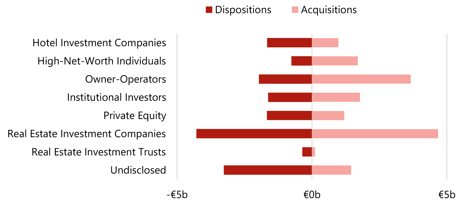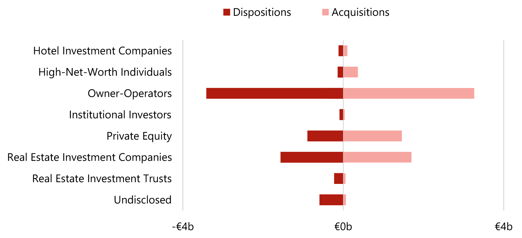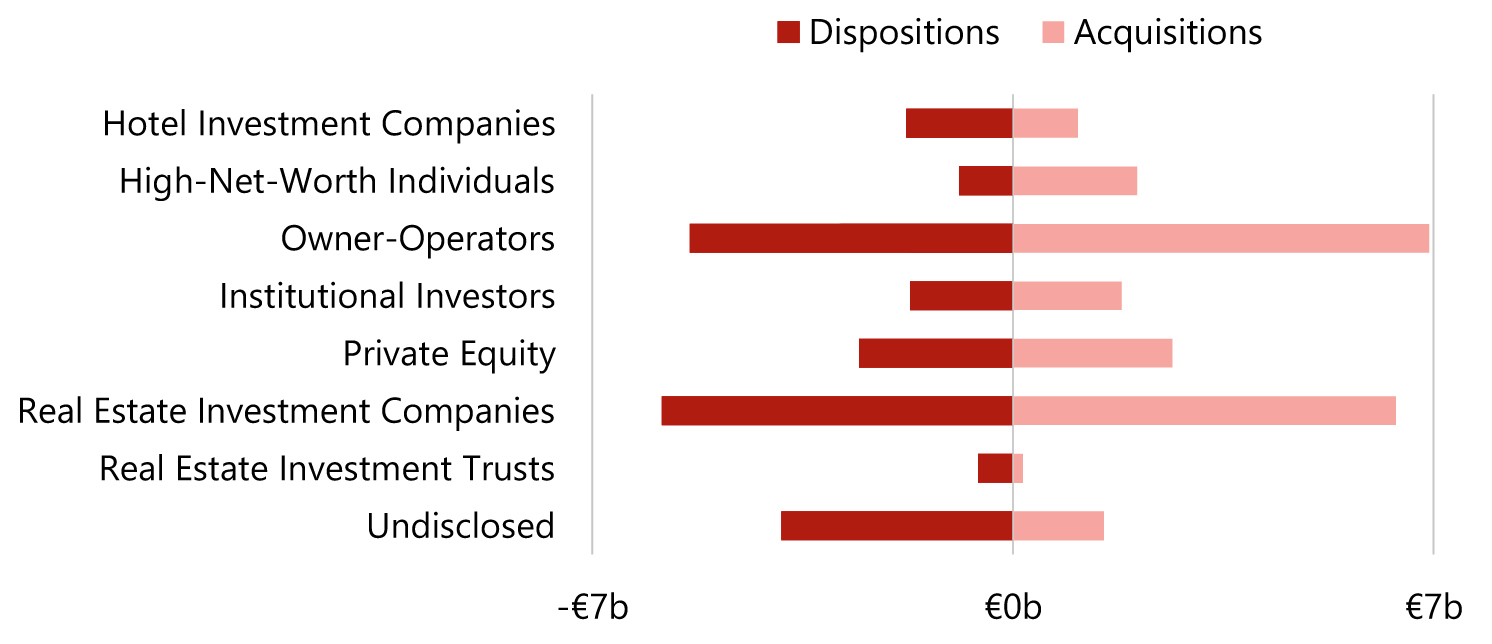- The largest net buyers were Owner-Operators and HNWIs, with a positive balance of €1.5 billion and €1.2 billion, respectively. The largest net sellers were Hotel Investment Companies and REITs, with a negative balance of €696 million and €416 million, respectively.