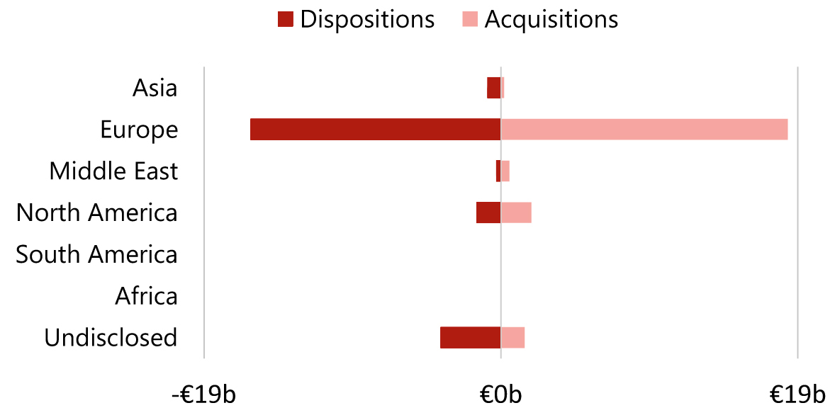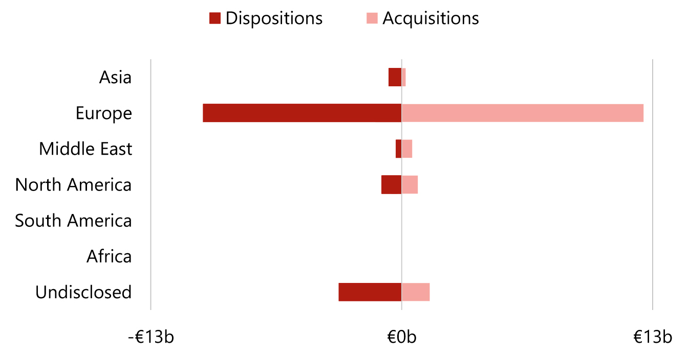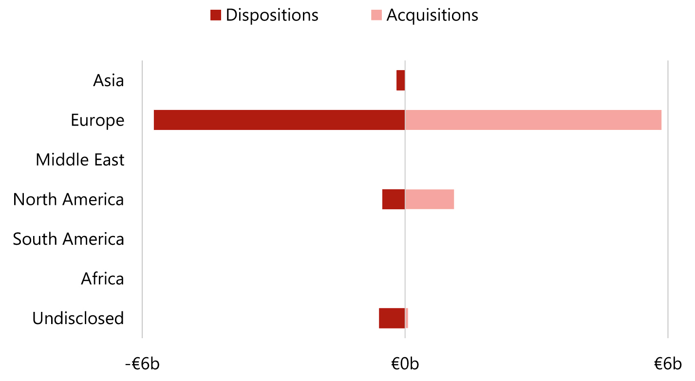 - In stark contrast to 2024, European investors reclaimed the top spot as the largest portfolio buyers of 2025, having lost the place to North American investors in 2024. However, with total acquisitions of €5.8 billion and sales of €5.7 billion, European investors’ volume remained relatively neutral in 2025;