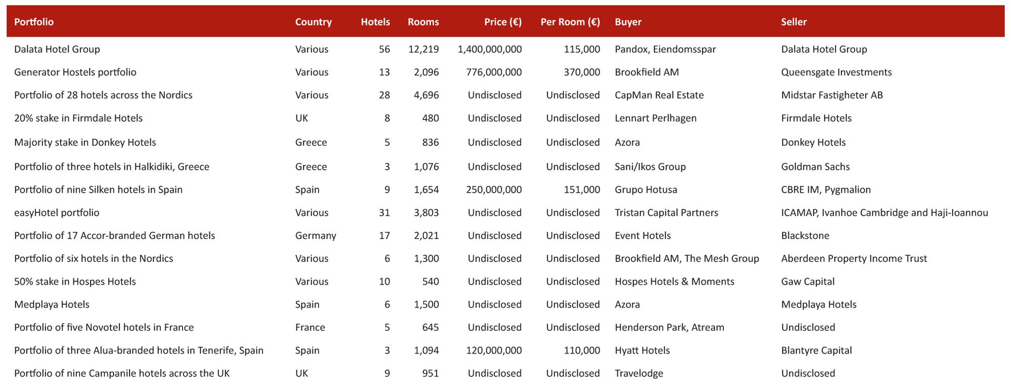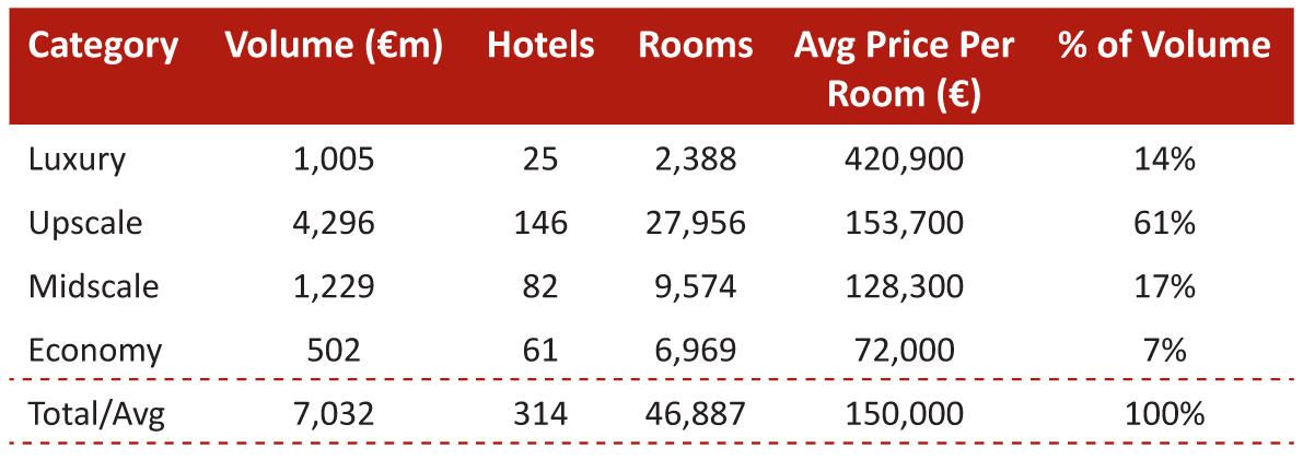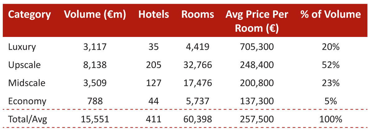 - With a high average price per room of €705,000, luxury hotels were the third-largest contributor to total transaction volumes (20% of total transaction volume), despite only accounting for 9% of total hotels sold.