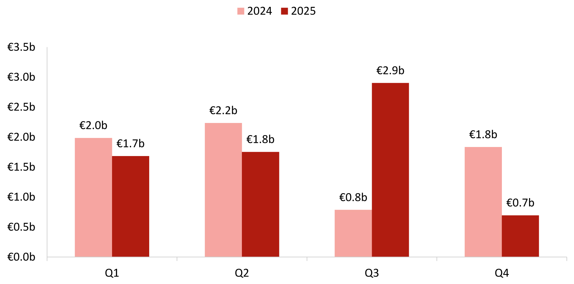 - Q4 2025 witnessed the strongest slowdown compared to 2024, falling 62% short (a €1.1 billion decrease) in total transaction volume.