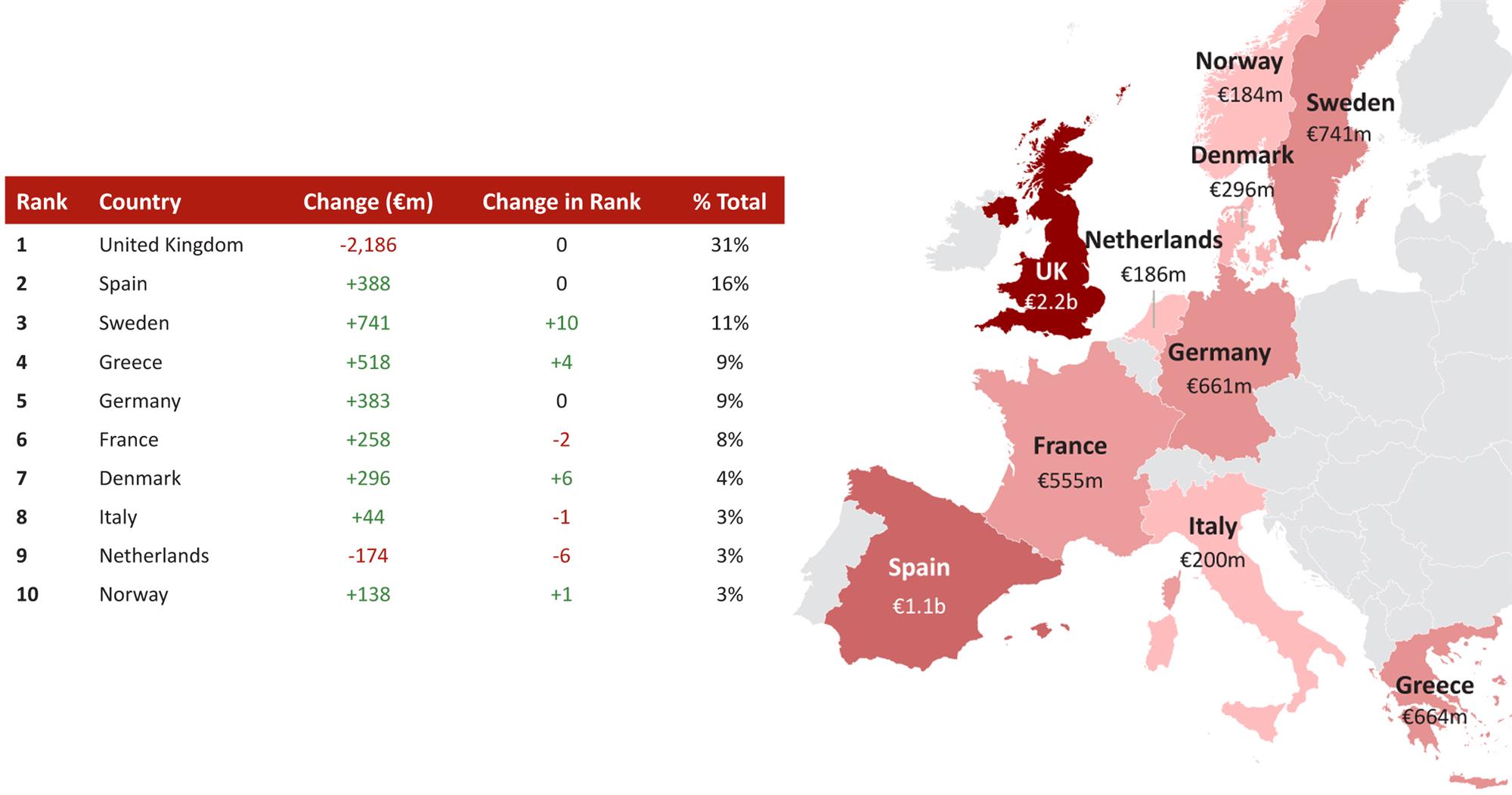 - Athens reached second place with a total volume of €271 million, followed closely by Paris at €267 million.