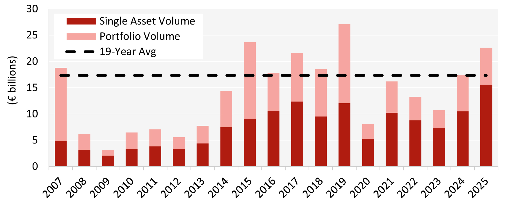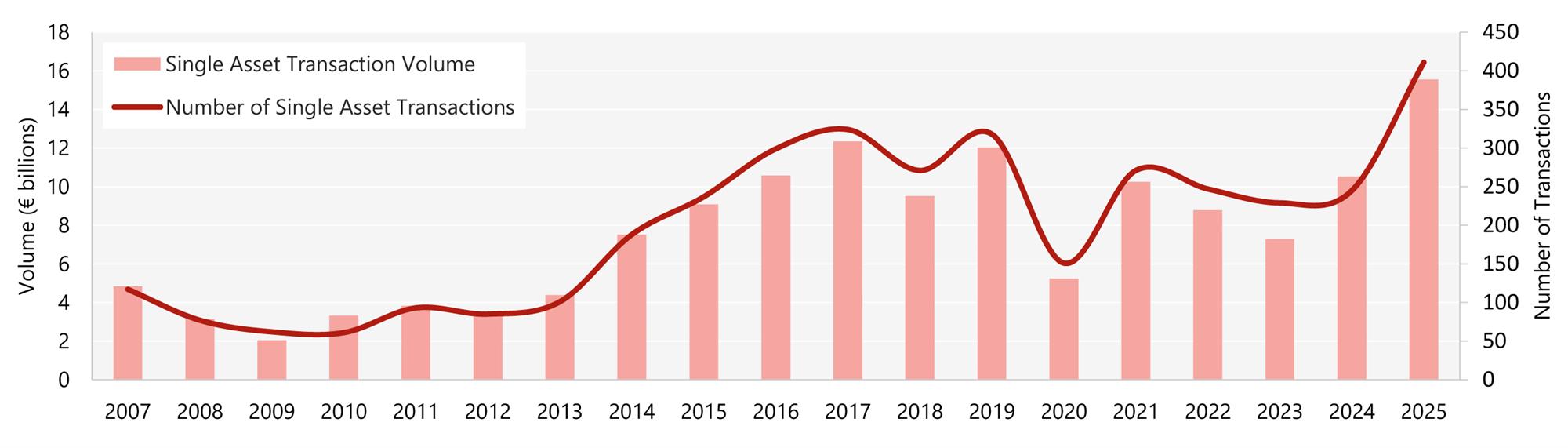 - Total transaction volume in 2025 reached €22.6 billion, the highest level recorded since 2019, and an impressive €5.2 billion increase over 2024, with single assets making up nearly 70% of the total.