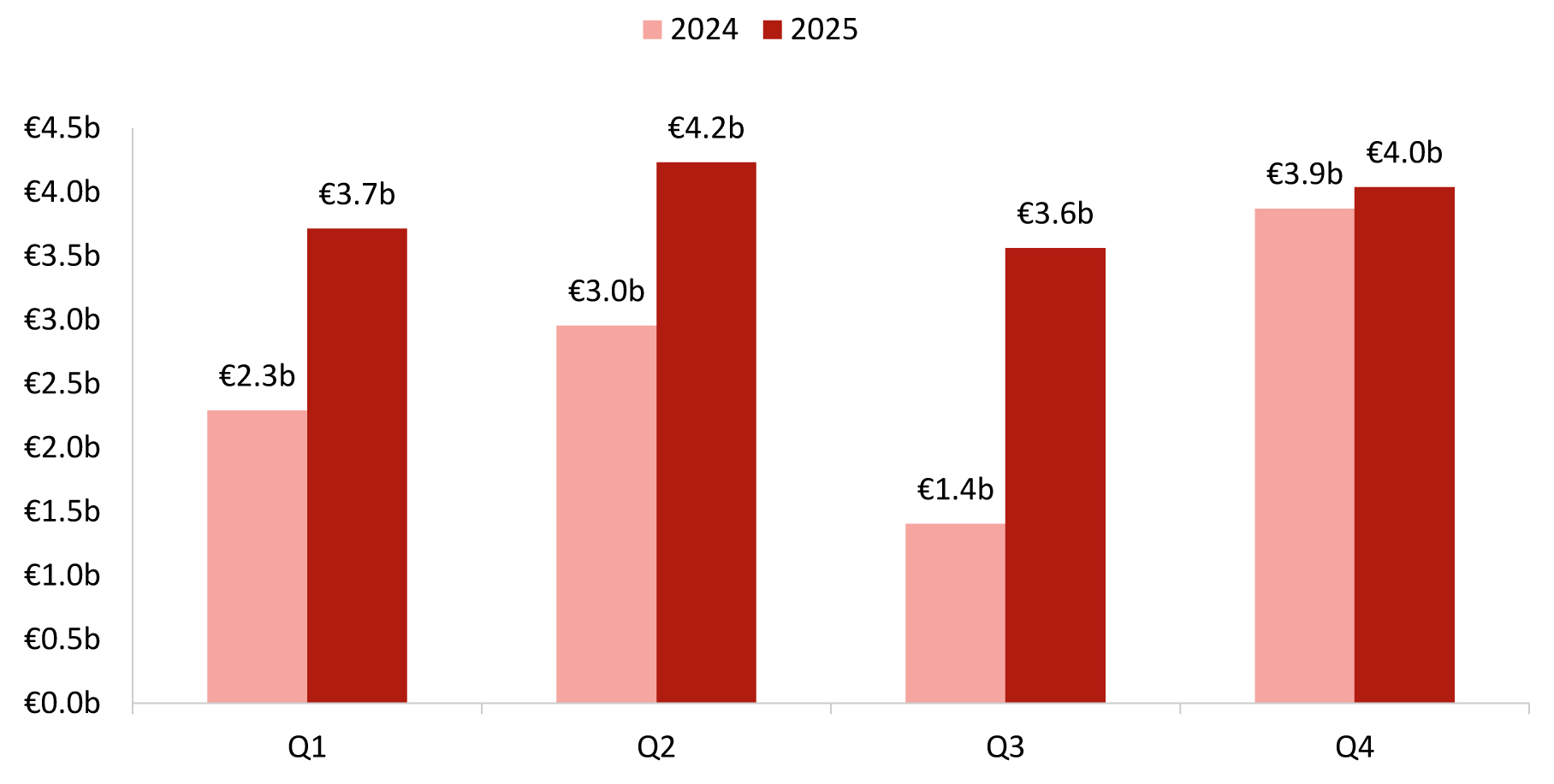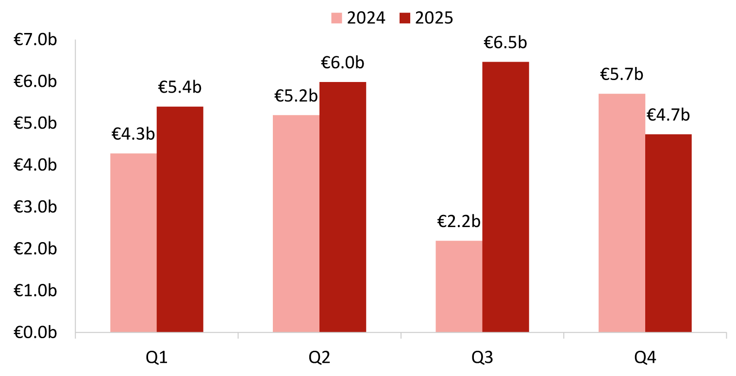 - Activity was split evenly between H1 (€7.9 billion) and H2 (€7.6 billion) 2025, with Q2 being the busiest quarter;