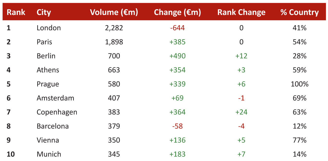 London retained its pre-eminent position as Europe’s most transacted city, recording €2.3 billion in deals. Berlin was the standout performer among key European cities, climbing 12 places in the rankings to third position with €700 million.