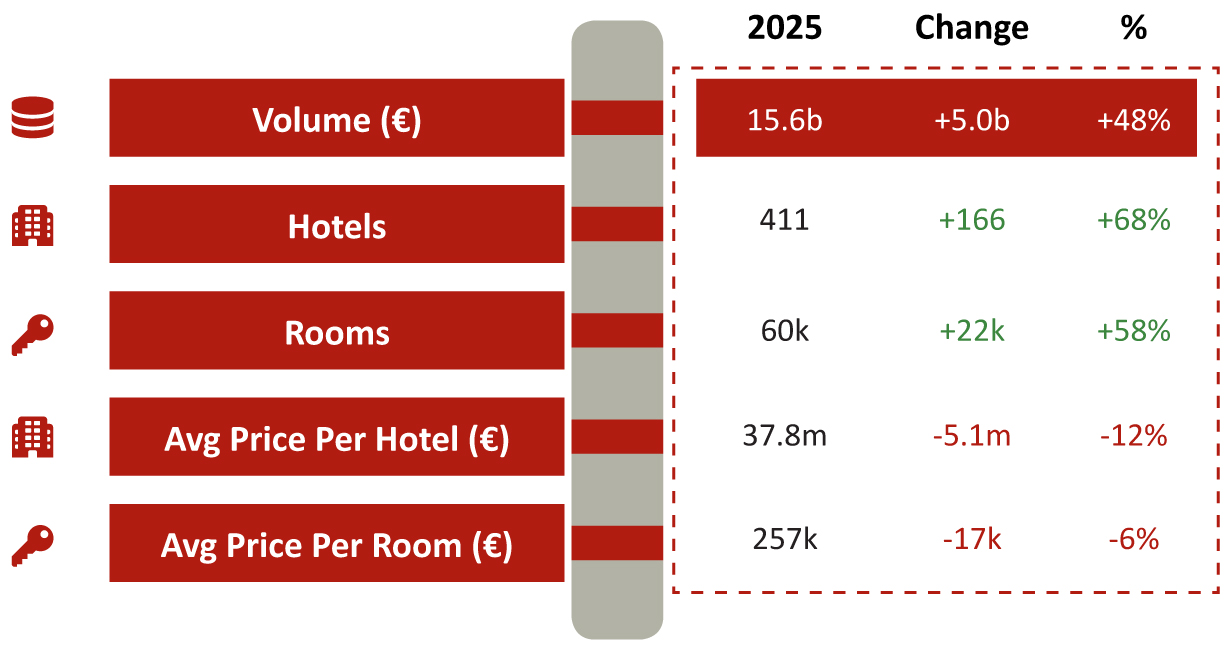 - Single asset transaction volume in 2025 totalled €15.6 billion, which was 48% greater than 2024 volumes and 29% higher than 2019. This makes 2025 the highest ever year on record for single asset hotel transaction volume in Europe;