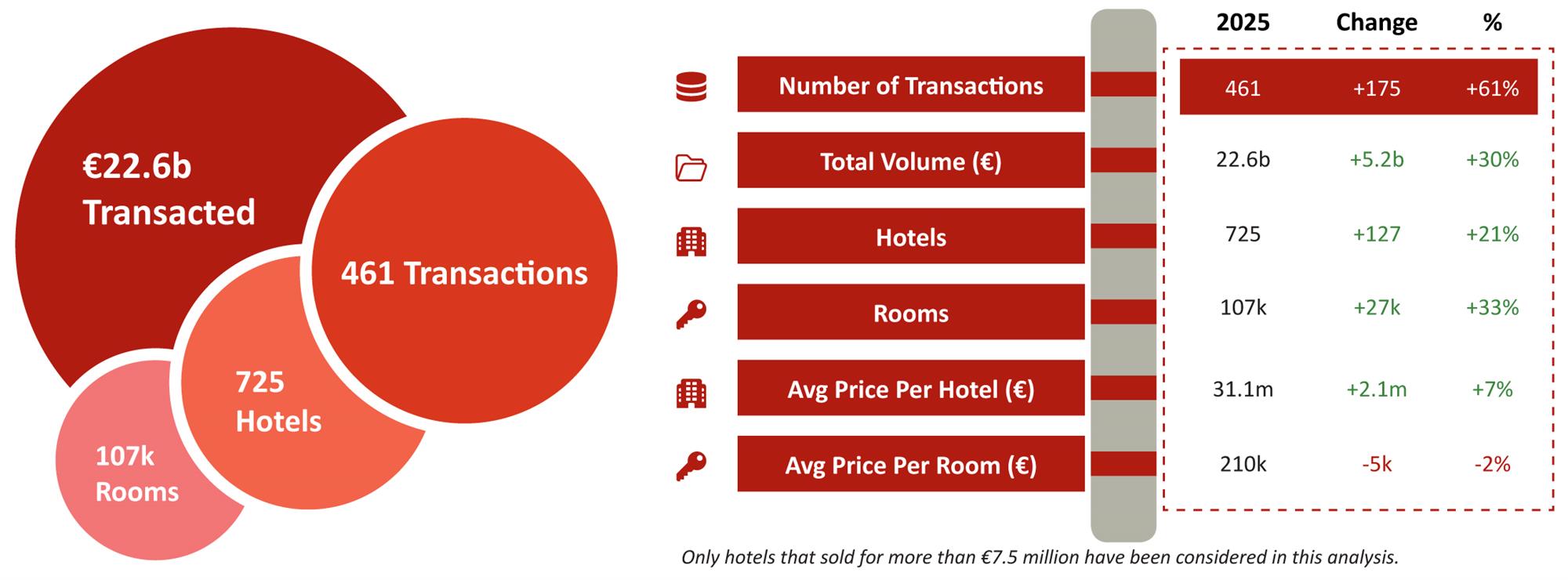 - Hotels in 2025 transacted for an average price per hotel of €31.1 million (a 7% increase on 2024) and had an average of 148 rooms (a 10% increase on 2024).