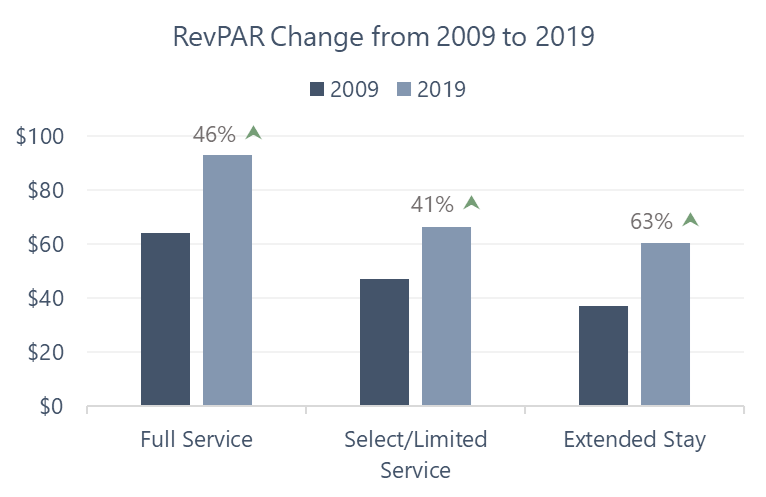 Extended-stay hotels had the quickest recovery from the pandemic, nearly returning to pre-pandemic RevPAR level by 2021, followed by select- and limited-service hotels, which surpassed pre-pandemic RevPAR in 2022, and then full-service hotels, which fully recovered in 2023.